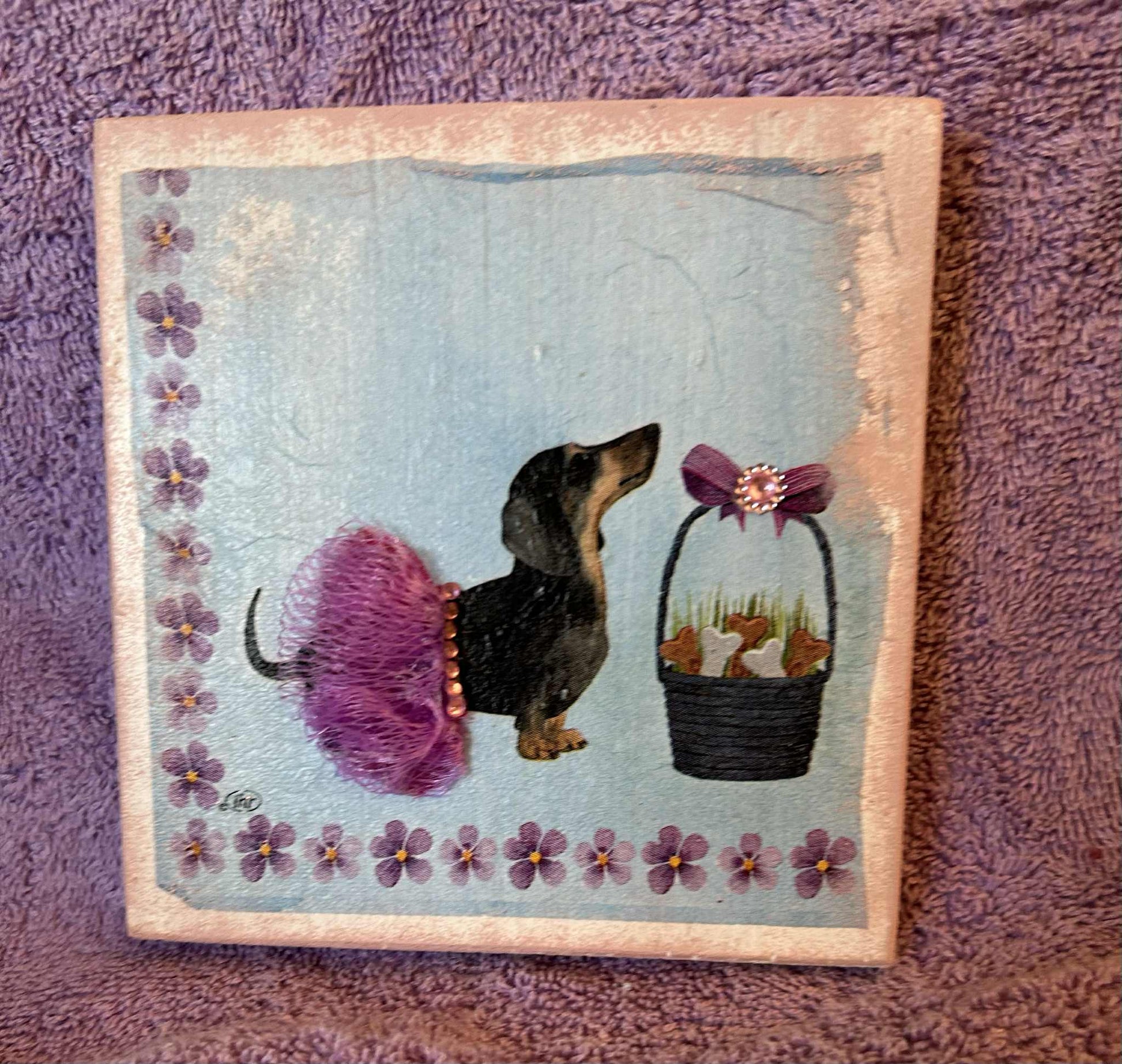 Sweet Black/Tan Dachshund in a purple tutu waiting for a treat.