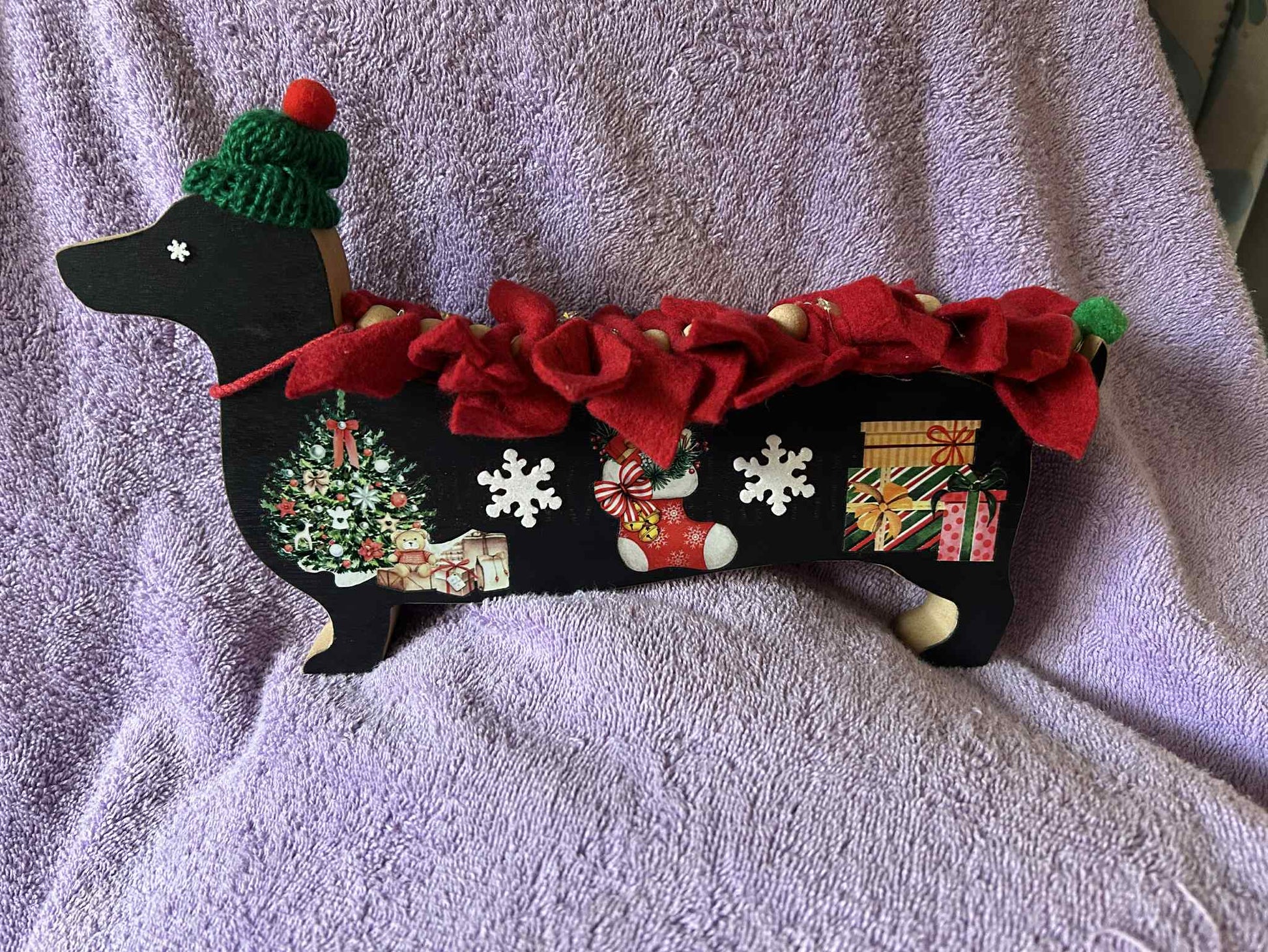Measuring 12" from nose to tail. Approx. 7" high. Decorated for Christmas morning.