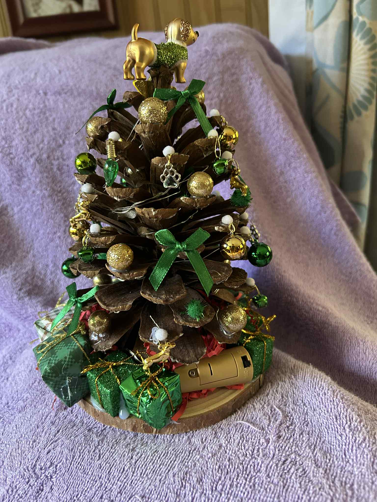 South Carolina Pine Cones turned into Dachshund themed Christmas Trees. Lit with battery operated lights. Measures 9.5".