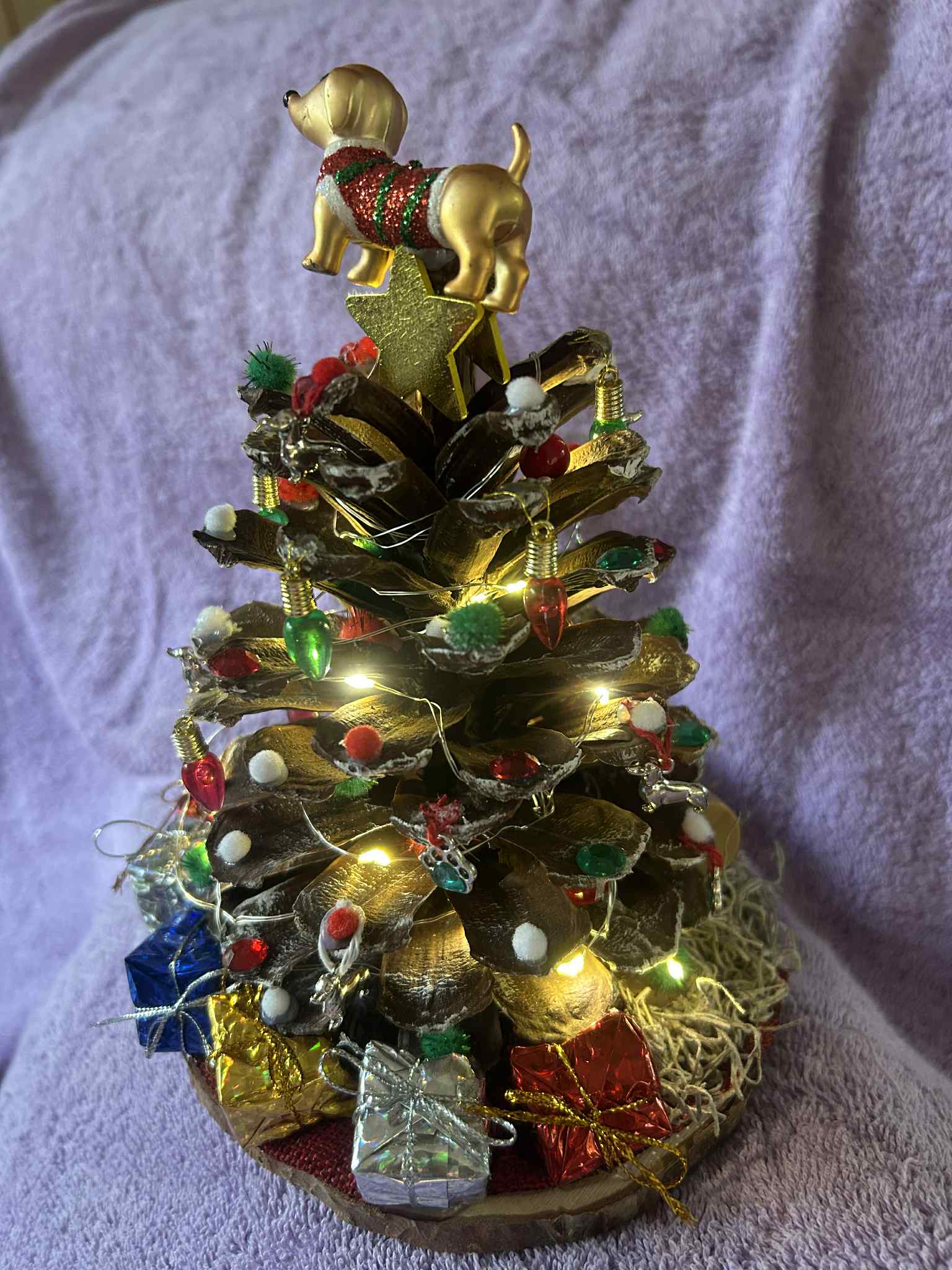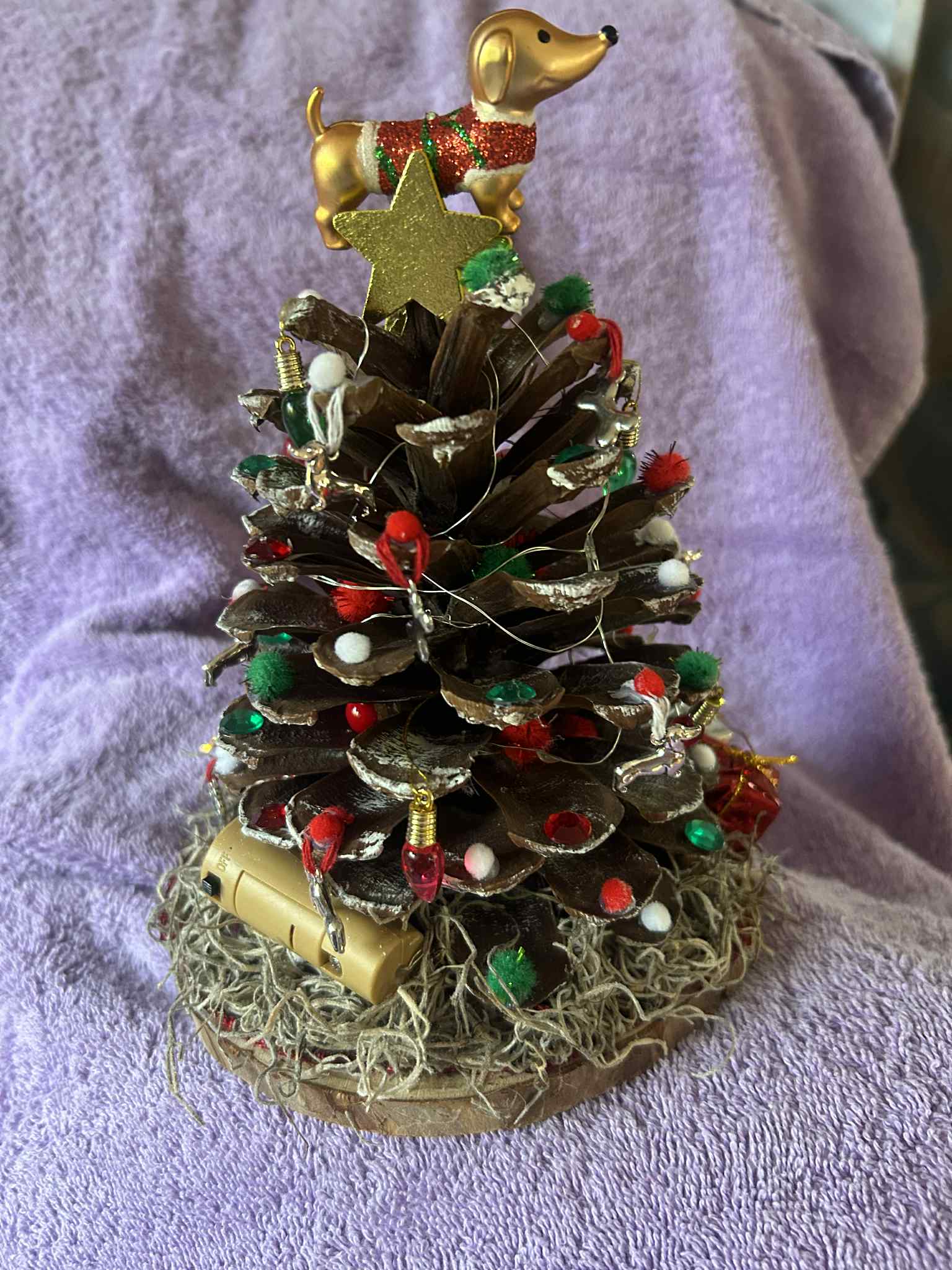 South Carolina Pine Cones turned into Dachshund themed Christmas Trees. Lit with battery operated lights. Measures 8.5".