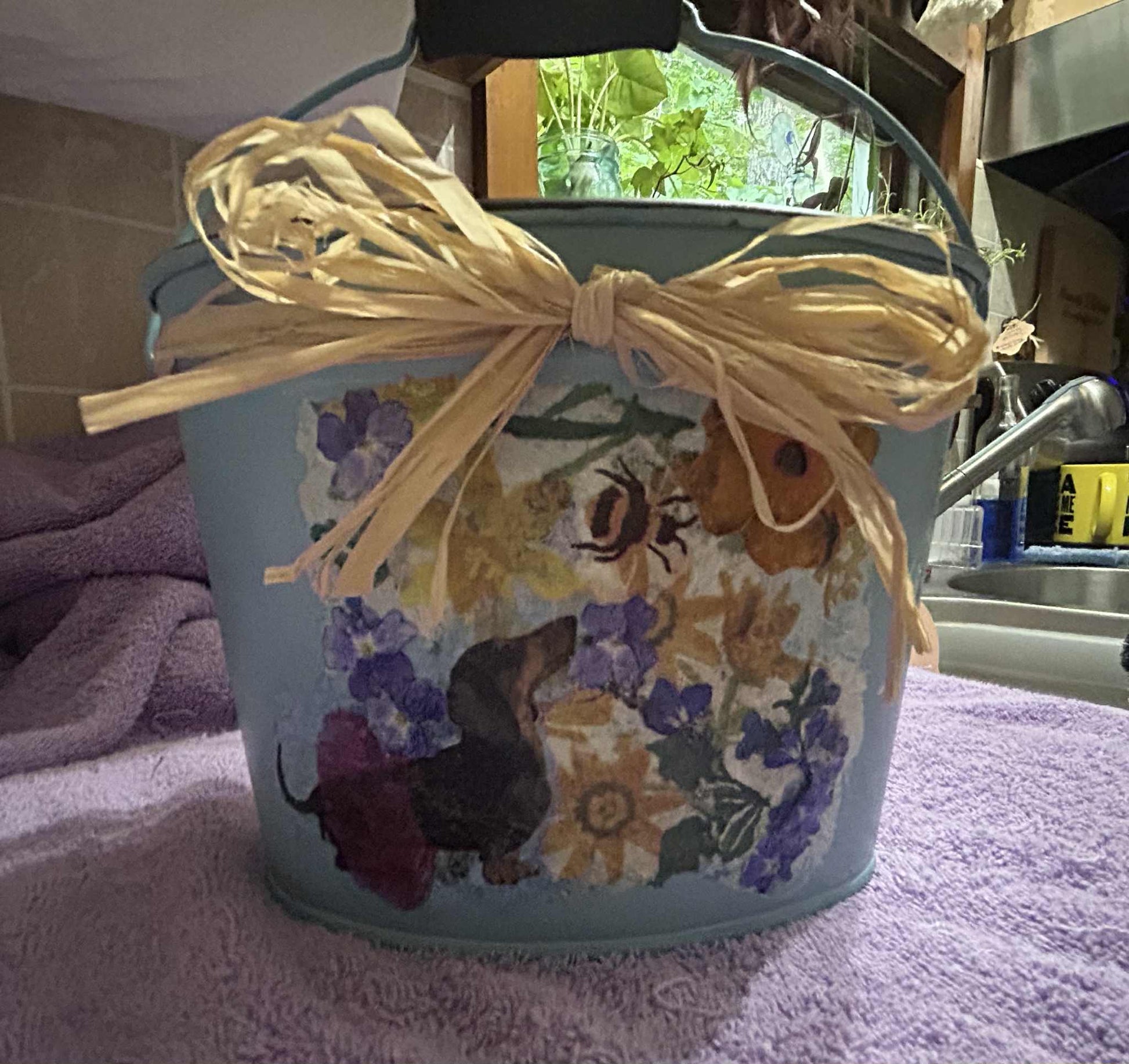 Blue metal bucket type holder with flowers. Measures 5"x7"x6". Brand new.