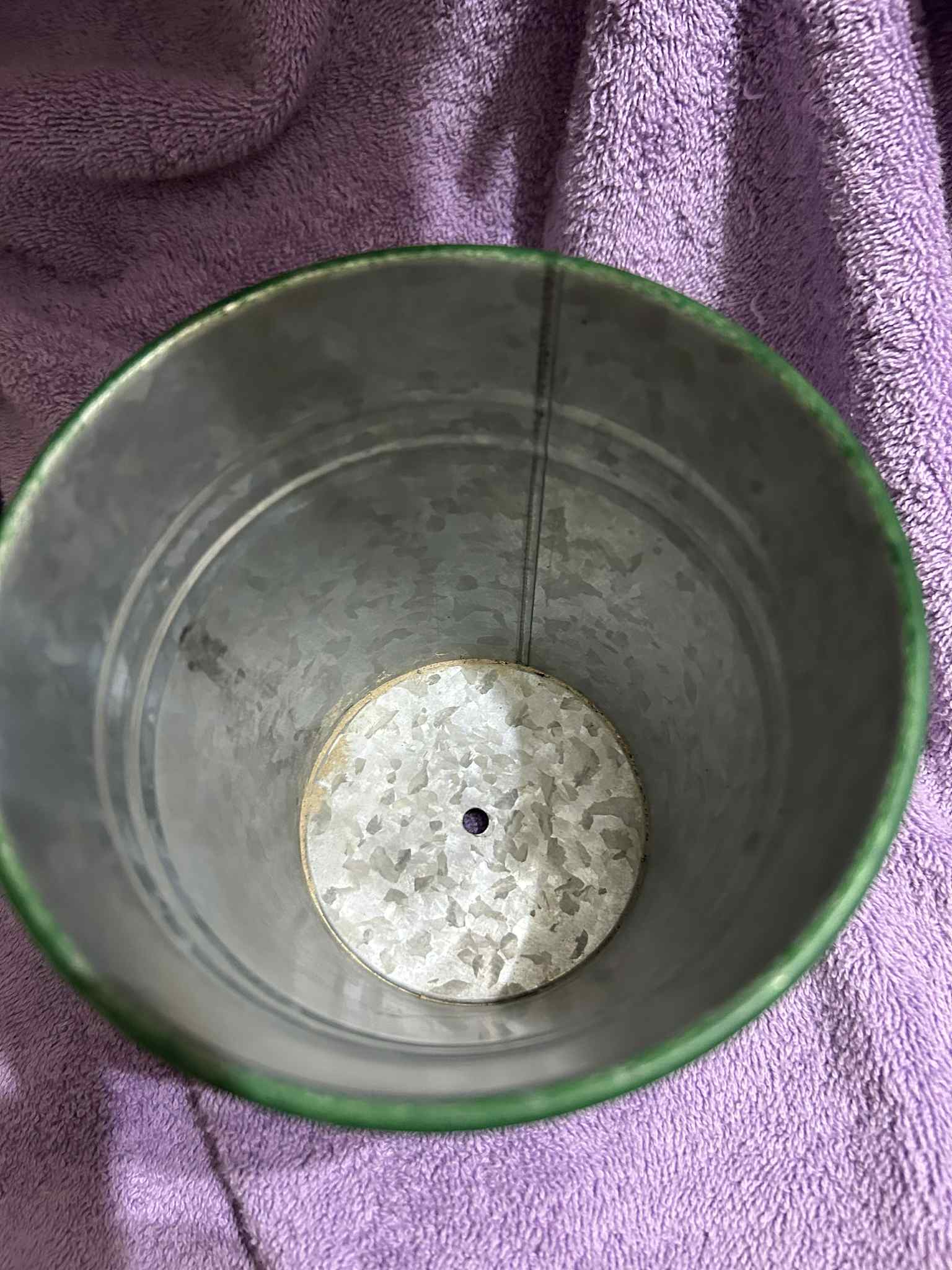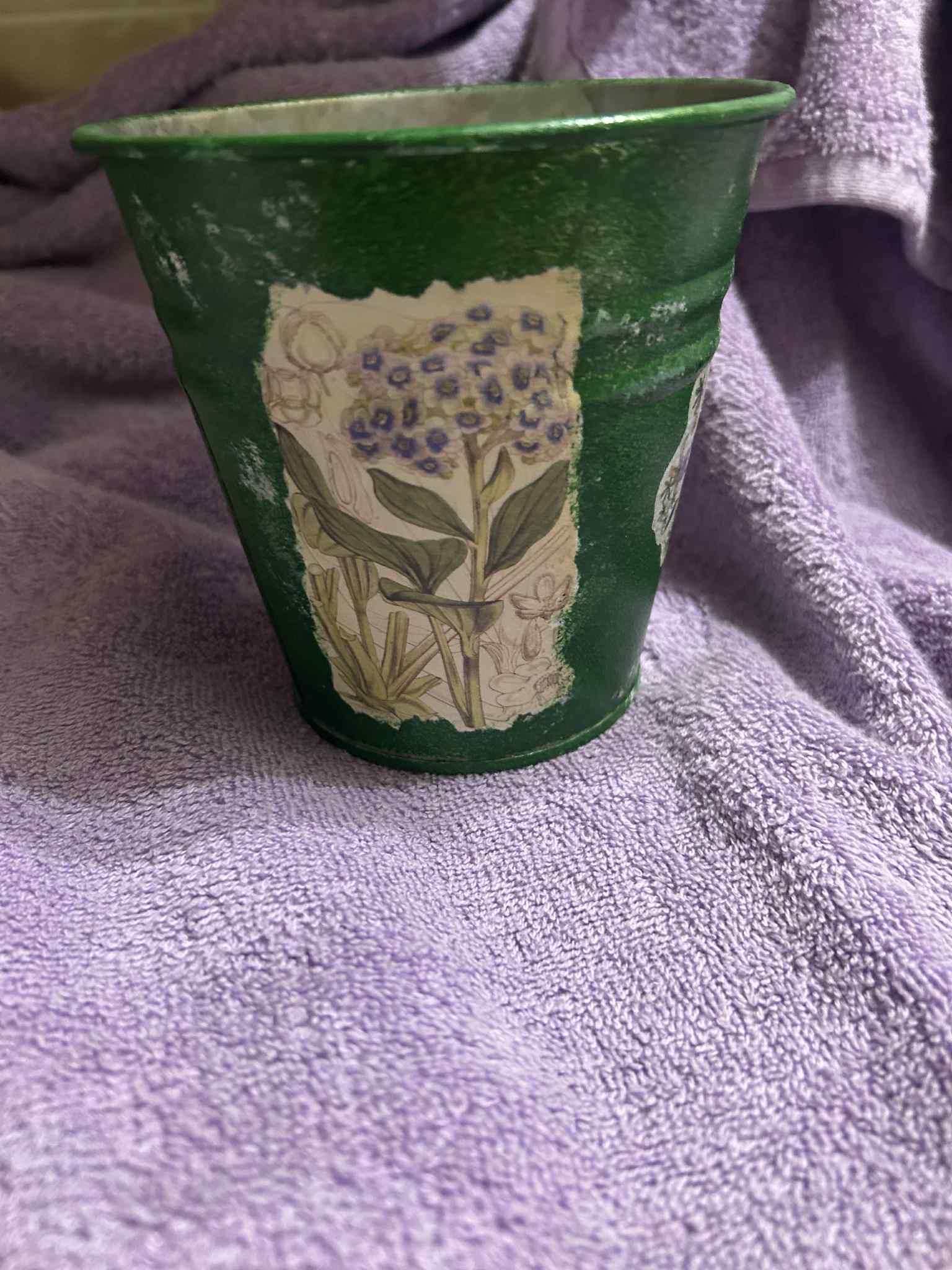 Old metal plant pot "re-pawed" with some paint & decoupage. Very cute!
