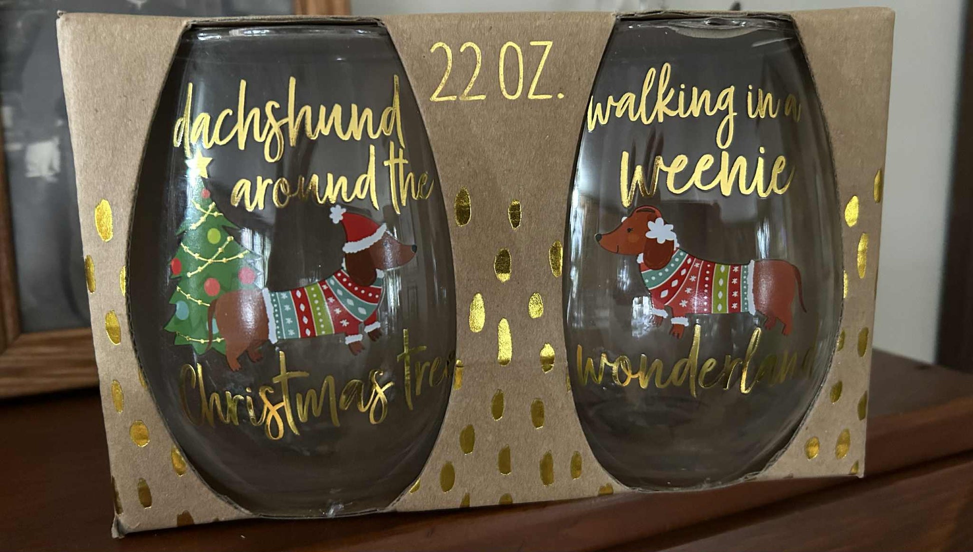 Set of 2 Stemless Wine Glasses. "Walking in a Weenie Wonderland" & "Dachshund Around the Christmas Tree". 22oz. In original package. Original msrp $20.00.