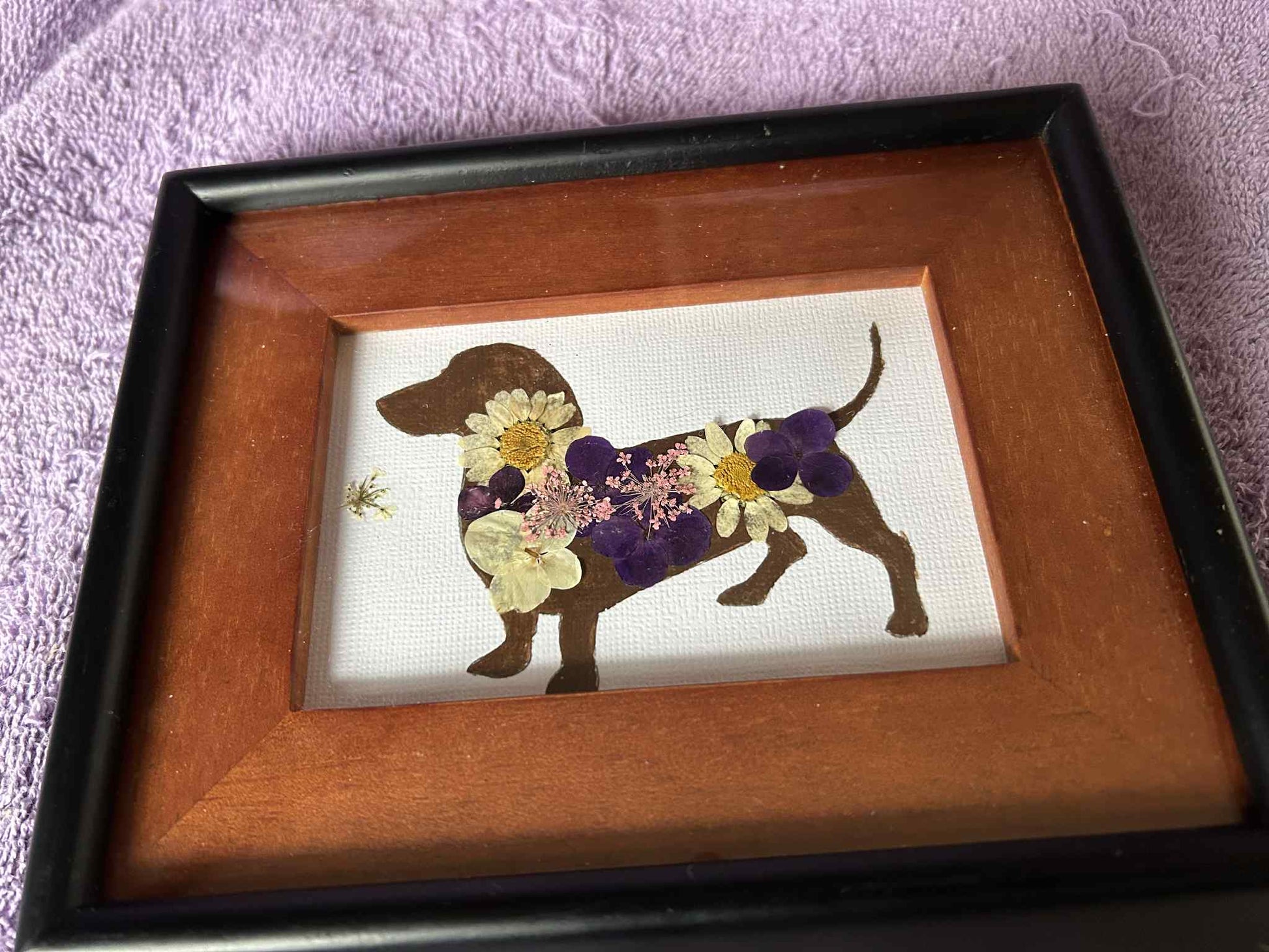 One of a kind Dachshund Picture. Made by Cape Cod Crafter "Robijon", this is a unique item. 5'x7" Hand painted Dachshund filled with her own pressed & dried flowers. Matted & framed.