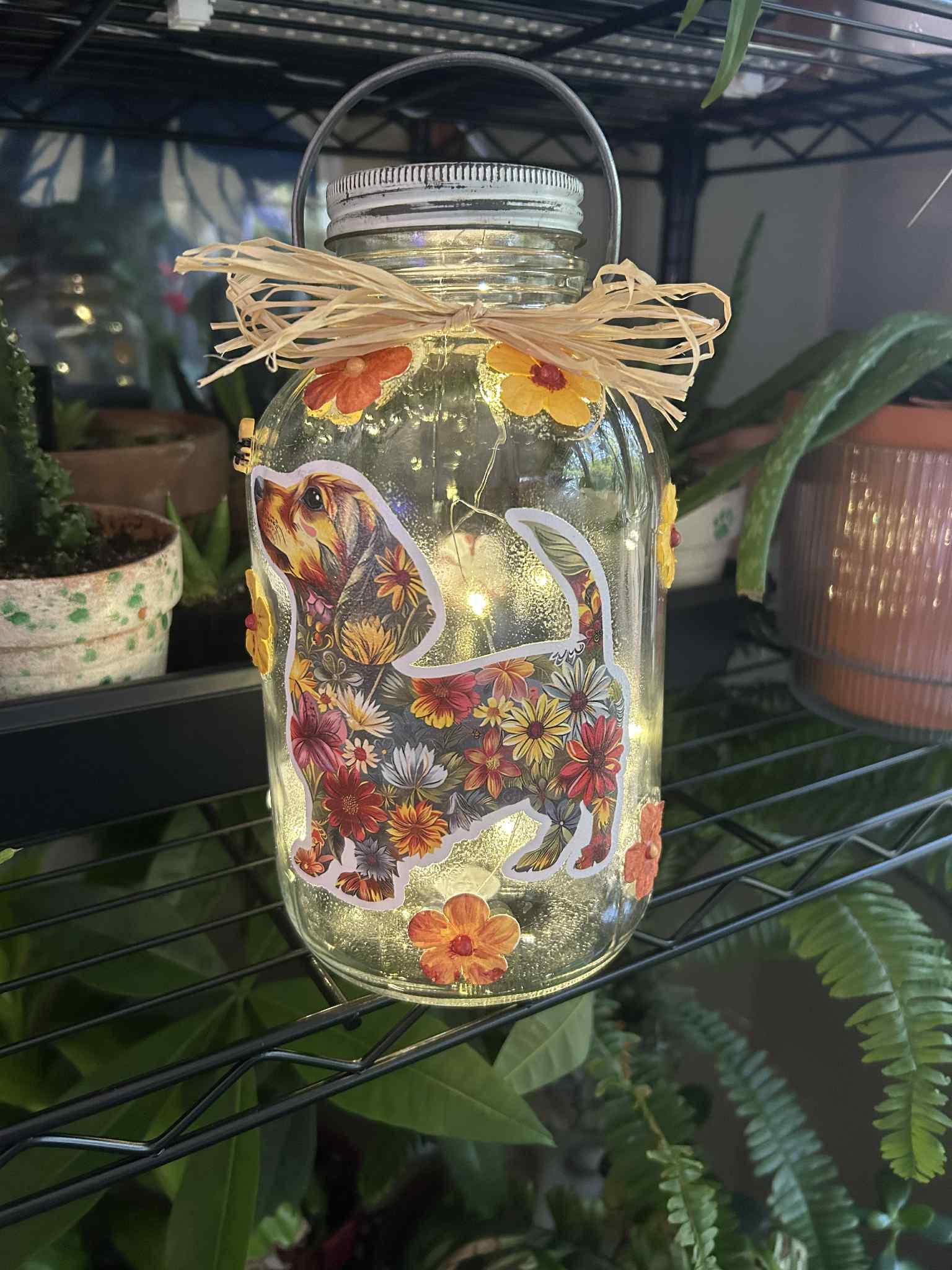 This antique glass bottle with cover & handle. Decorated with paper flowers & a lovely flowered Dachshund. Lighted. Measures 8". One of a Kind!