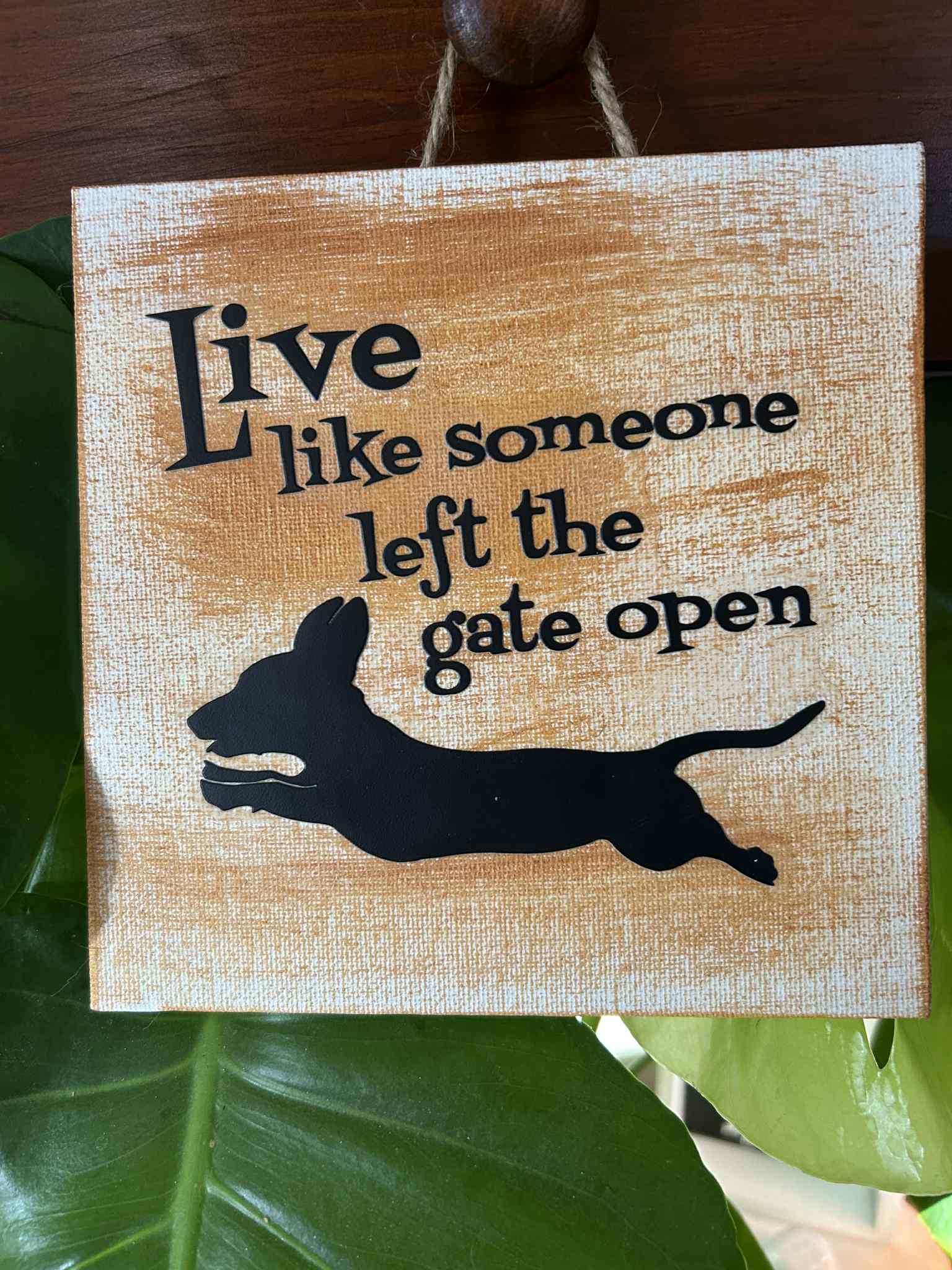 6"x6" Painted canvas with "Live Like Someone Left The Gate Open" Dachshund. Cute!