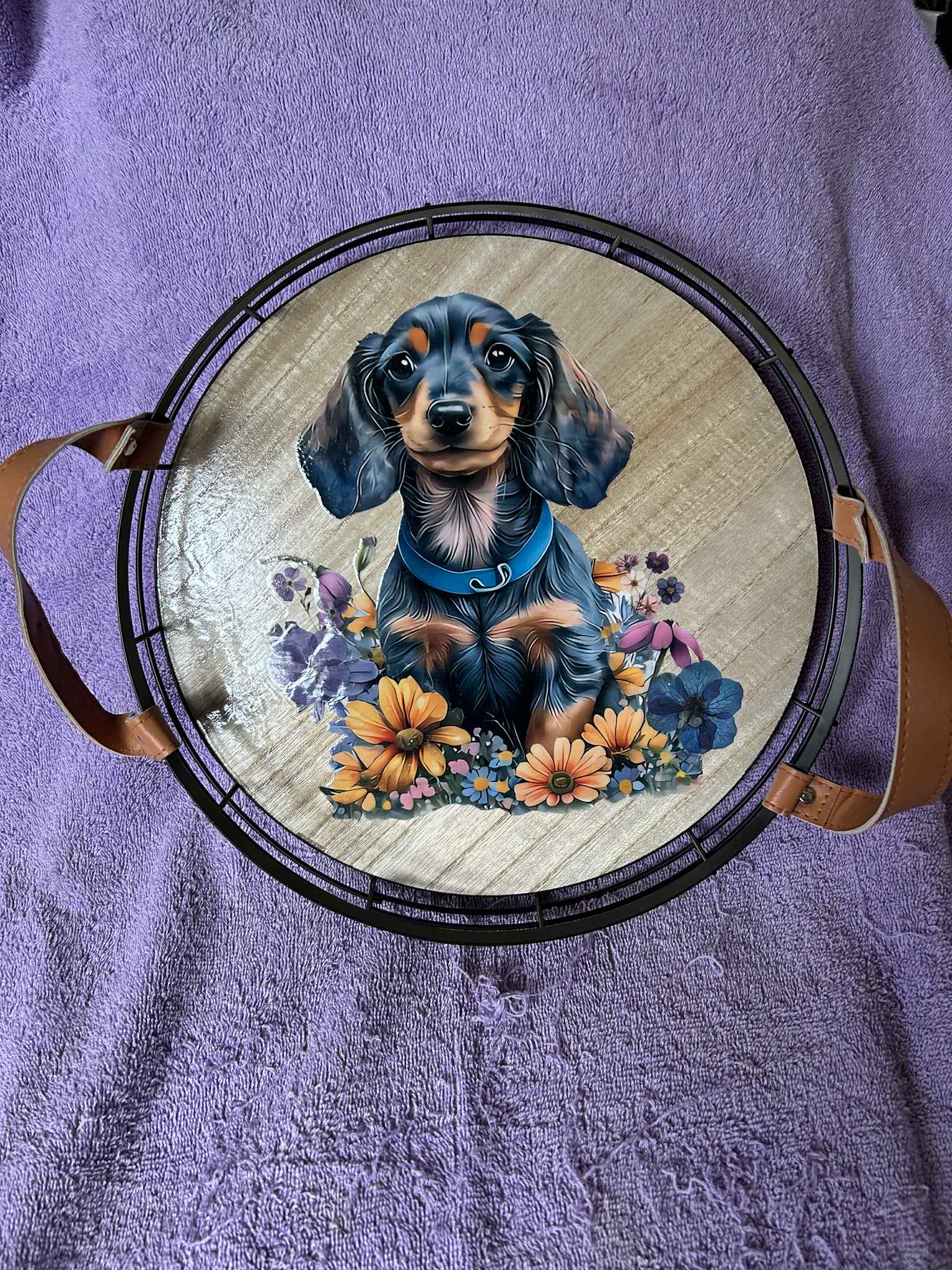 12"x12" Round Tray. Leather handles, black wire, pressed board bottom. Decoupaged & sealed.