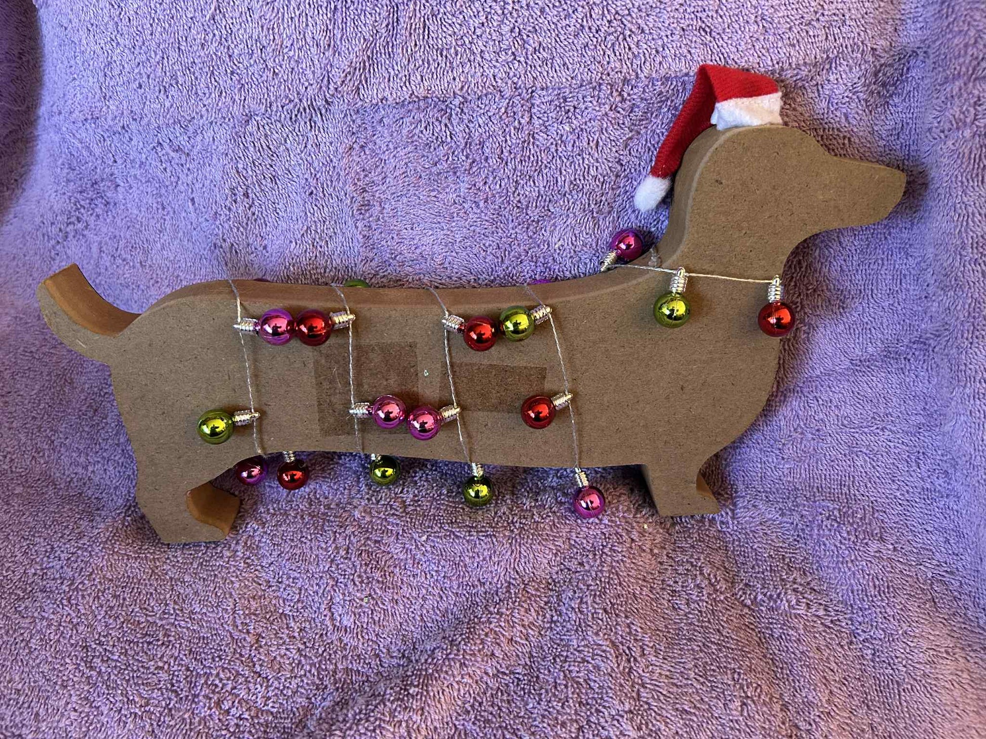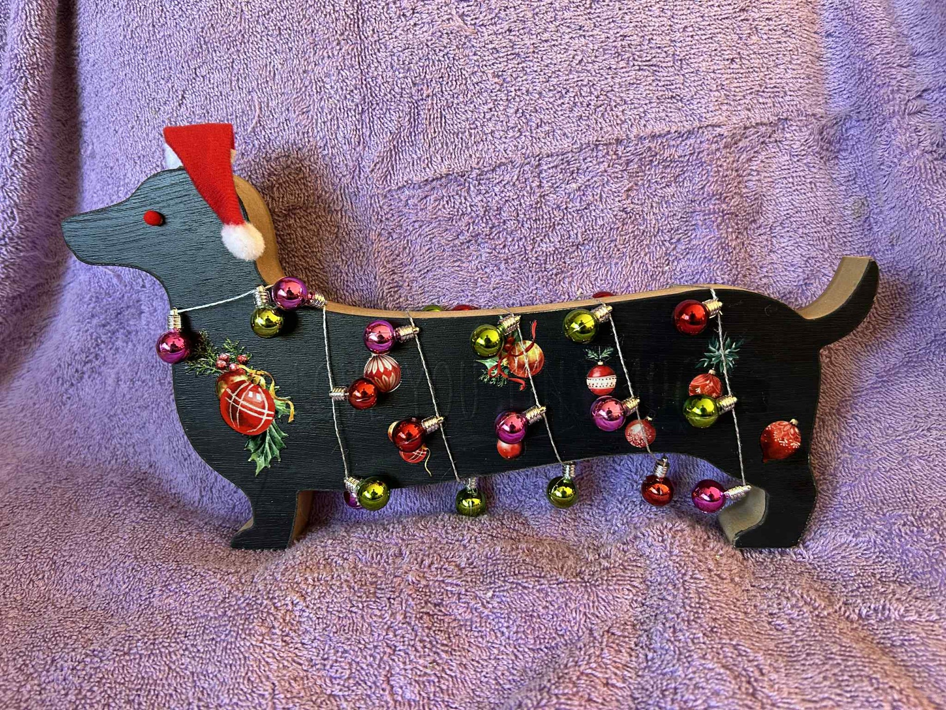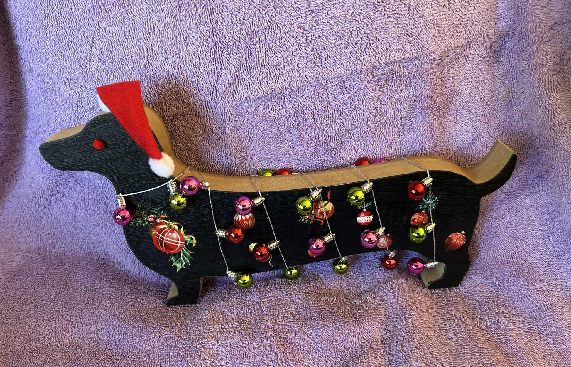 Measuring 12" from nose to tail. Approx. 7" high. Decorated with a string of balls & a hat.